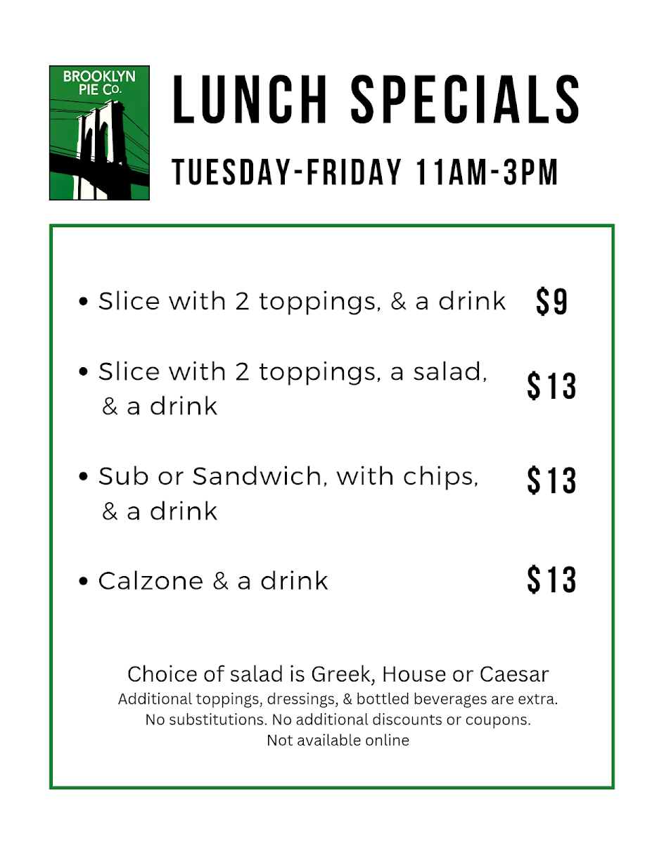 Original Brooklyn Pie Co. brings a slice of authentic New York-style pizza straight to Round Rock, TX. Their menu highlights include the iconic Giant Slice—a crispy, face-sized cheese slice perfect for pizza lovers craving bold simplicity. For those seeking variety, the thin crust pizzas come with a solid range of classic toppings, embodying the rich flavors of the Northeastern corridor. Beyond pizza, the sandwich selection stands out with offerings like the Chicken Panini Pesto, featuring grilled chicken, mozzarella, and roasted red peppers on sourdough, and the hearty Italian and Meatball Subs, toasted to perfection and layered with savory cheeses and meats.